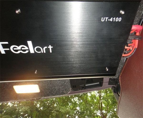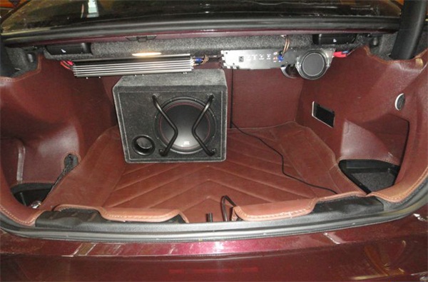 负责驱动车门音响喇叭的功放则选择吊装于后备箱上方,既不占用空间也很方便调音。后备箱功放线束连接有条不乱,规整有序,细节非常的重要这样才能保证好的音效
