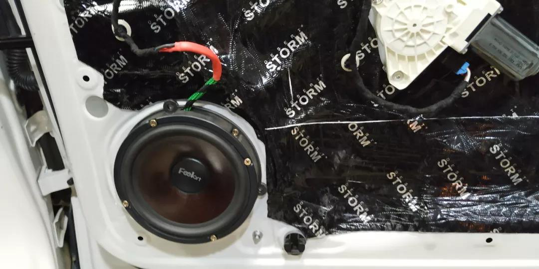 隔音工作完成之后便进行最主要的喇叭安装事宜,前声场选用的是芬朗爆款喇叭SQ-6.5E,自打出品以来就得到众多车主喜爱,超高的性价比是它的代名词,特殊纸浆中低音音盆,蚕丝球顶振膜高音,风格综合,通透自然,实为新手车主的不二之选。