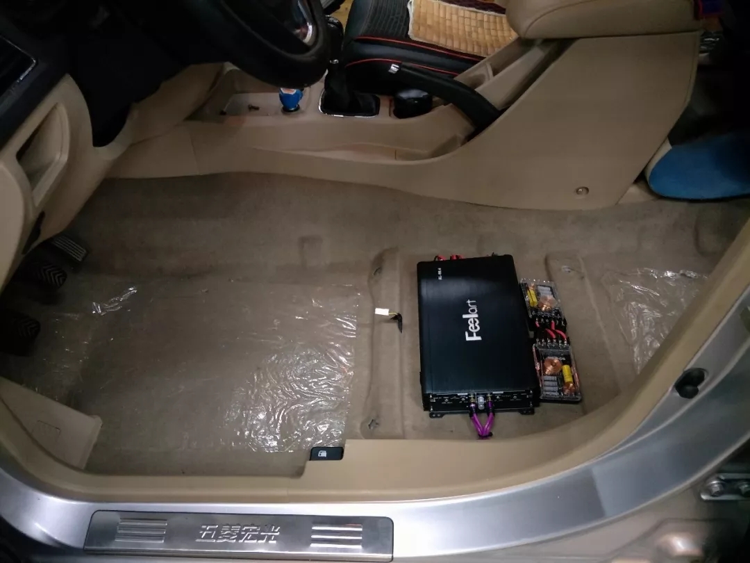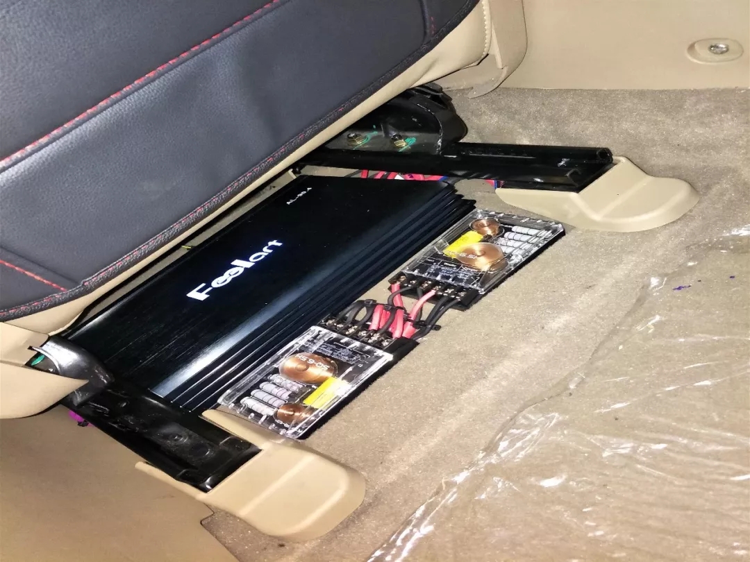 芬朗SQ-6.5H分频器及AL-90.4四路功放隐藏安装在座椅下