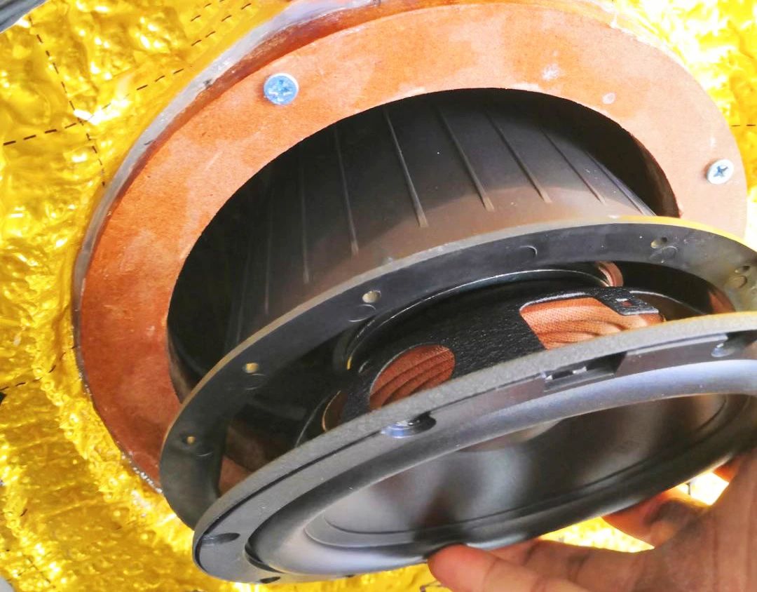 中低音安装在原喇叭位,安装过程注意防水木垫圈和防水罩的搭配。