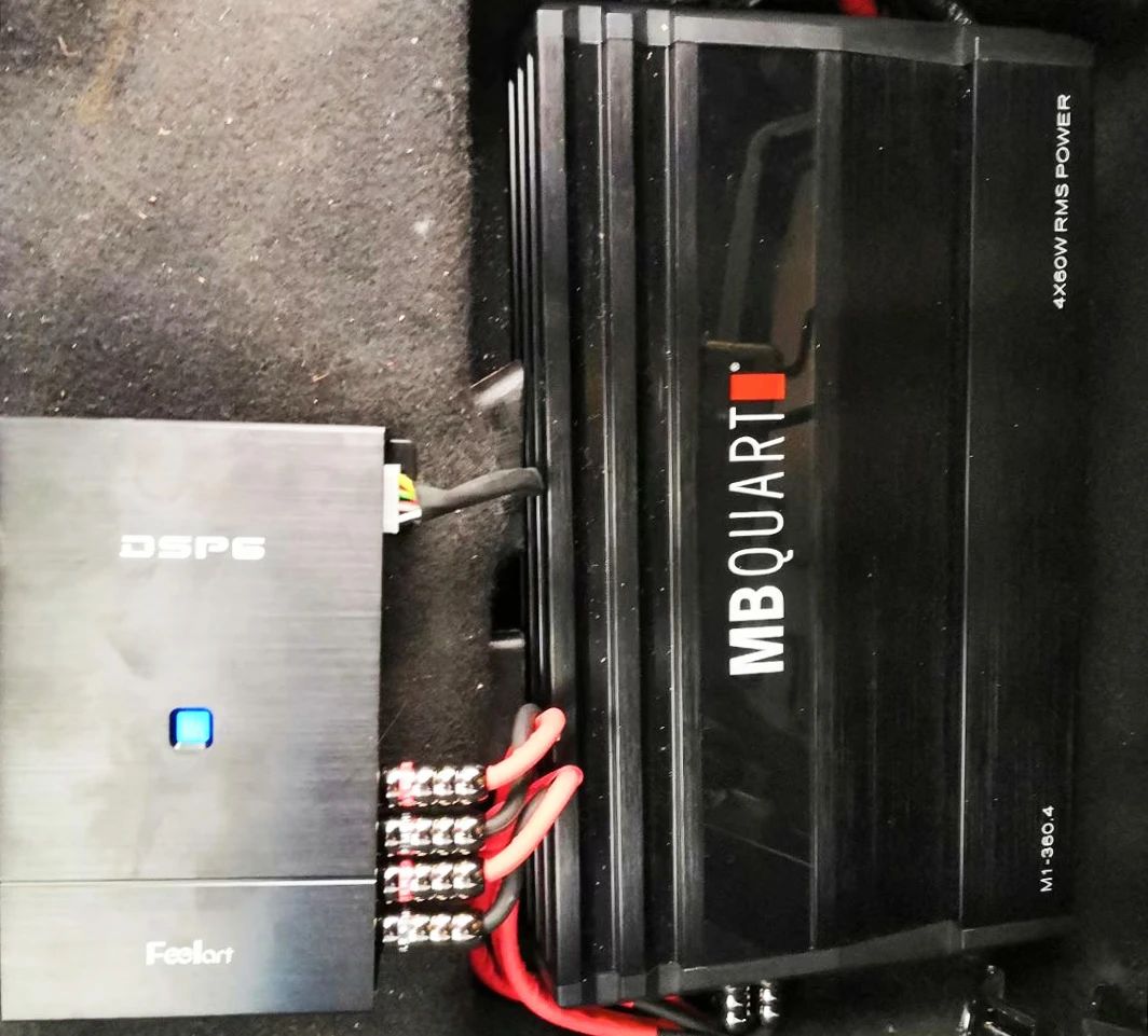 随后为增加整体音响系统的动听性,增加了一台歌德功放和一台芬朗DSP6,德国歌德M1-360.4功放用于喇叭在大动态环境下有足够功率推动,芬朗DSP6用于调节音响层次感,使车主的主驾驶位轻松聆听舞台感。