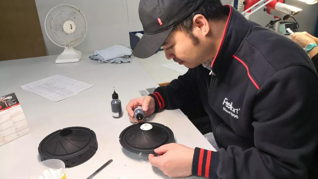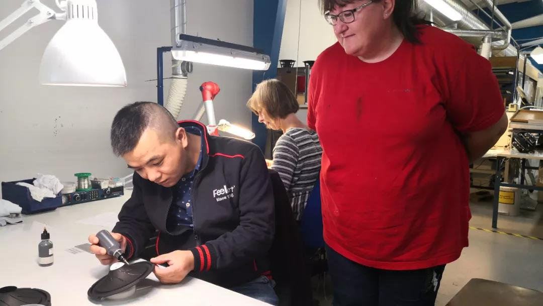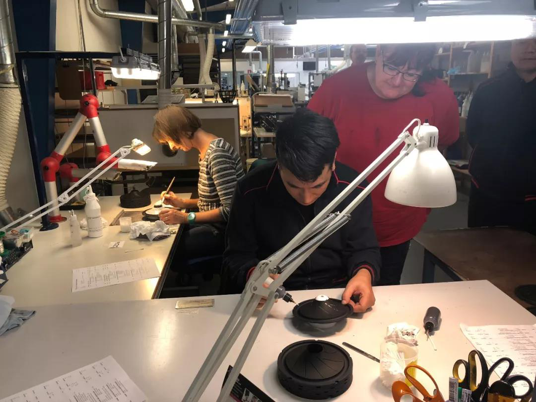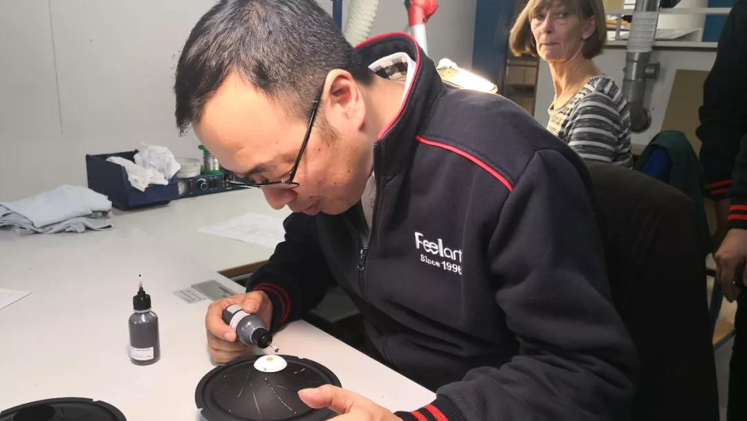 介绍完产品的特色后,大家纷纷提议去参观扬声器的制作工艺,于是在Jann的带领下,大家一同来到了平时的工作区,芬朗UT和EU系列的扬声器制作可谓是用“精致”来形容,不是一群人在流水线的工作方式,设计稿、零配件、工作器材全都在工作区,内室不允许存在多余的物体。